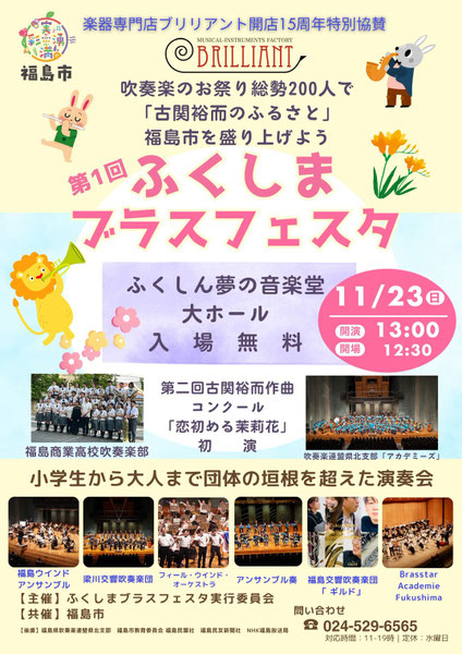 福島市の楽器専門店「ブリリアント」さんの開店15周年を記念したイベント「ふくしまブラスフェスタ」が、ふくしん夢の音楽堂で開催されます。